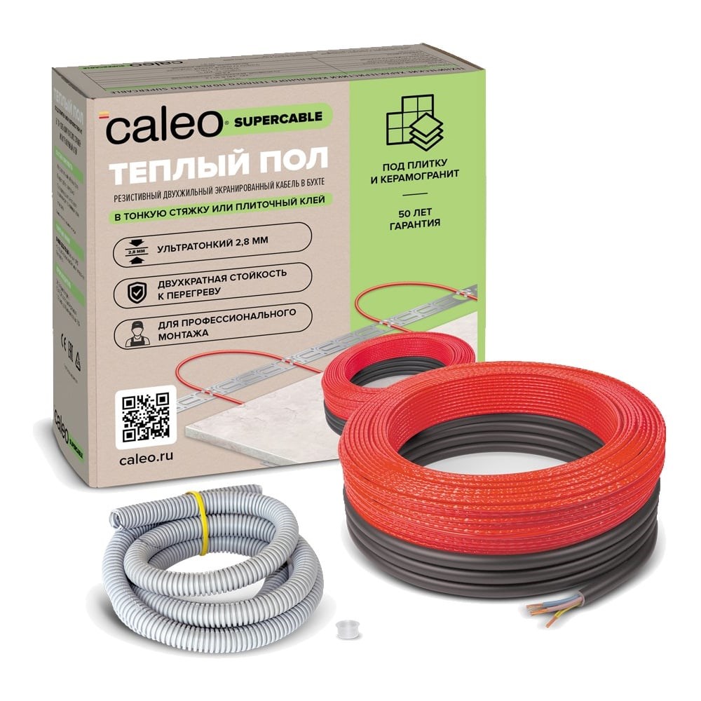 Комплект теплого пола CALEO Supercable 18W-40 предназначен для монтажа в тонкую стяжку, плиточный клей или наливной пол. Кабельный теплый пол обеспечивает подогрев поверхности пола для создания дополнительного комфорта или основного обогрева помещения. Область применения: гостиные, кухни, ванные комнаты, столовые, детские комнаты. Рекомендуемые напольные покрытия: керамическая плитка, керамогранит, природный камень.Особенности CALEO SUPERCABLE:Сверхтонкий (2,8 мм) нагревательный кабель в бухте на основе двухжильного экранированного резистивного кабеля повышенной надежности, не уменьшает высоту помещения;Идеален для монтажа в помещениях co сложной конфигурацией;Возможность укладки во влажных помещениях;18 Вт/ пог. м или 130-200 Вт/м2 (зависит от шага укладки витков кабеля) - для стандартных и холодных помещений, для комфортного или основного обогрева;Наружная и внутренняя изоляция из высокотемпературного фторполимера;Экран в виде оплетки из медной луженой проволоки;Гарантия - 50 лет.Строение кабеля CALEO SUPERCABLE:Внешняя оболочка кабеля (фторполимер);Экран;Оболочка нагревательных жил (фторполимер);Нагревательная жила.