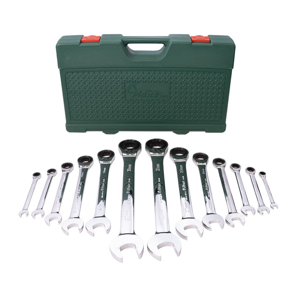 Комплект трещоточных комбинированных ключей 8-32мм, 13шт Hans 166513MB - прекрасный вариант ручных инструментов для легкого и быстрого выполнения крепежных работ. Ключи имеют двустороннее применение (сочетание рожковой и кольцевой головок). Накидные головки оснащены трещоточными механизмами. В комплекте предусмотрен кейс для удобства хранения и транспортировки набора.