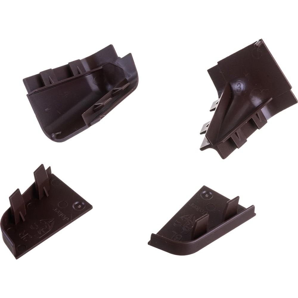 Комплект заглушек к плинтусу для столешниц ООО ДЕКОПЛИНТ ДЖОКЕР 3 - 10 шоколад 1131 включает угол наружный, угол внутренний, торцевые заглушки. Данные соединительные элементы позволяют осуществить сборку изделия в момент монтажа, учитывая конфигурацию кухни.