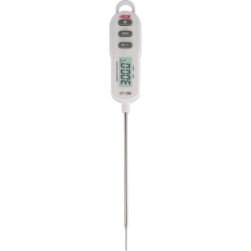 Термометр цифровой RGK CT-106 служит для контактного измерения температурных параметров целевых объектов в пределах от -40 до + 300°C, обеспечивая точность ±0,5°С в диапазоне от –20 до +150°С. Инструмент оснащен батарейным питанием и несъемным заостренным и утонченным в передней части погружным зондом, оболочка которого изготовлена из пищевой нержавеющей стали, позволяющим оперативно определять температуру внутри жидких, вязких, сыпучих веществ и материалов, продуктов питания и т.п. Изделие характеризуется высоким быстродействием за счет малого времени отклика и подходит для бытового и профессионального применения. Благодаря водонепроницаемому исполнению корпуса из двухслойного ABS-пластика, который используется в качестве ручки при выполнении работ и соответствует категории пыле-влагозащиты IP66, контактный термометр в случае загрязнения можно мыть под струей воды, без замачивания. Питание измерителя производится от батарейки типа CR2032. Для подвешивания инструмента при неиспользовании предусмотрена полукруглая скоба в верхней части ручки. Также изделие оборудовано магнитным креплением, которое встроено с тыльной стороны корпуса. Защиту зонда в нерабочем положении обеспечивает съемный пластиковый наконечник. С целью упрощения снятия показаний цифровой термометр RGK CT-106 реализует функцию HOLD, которая при нажатии соответствующей кнопки обеспечивает удержание текущих результатов замеров на дисплее.