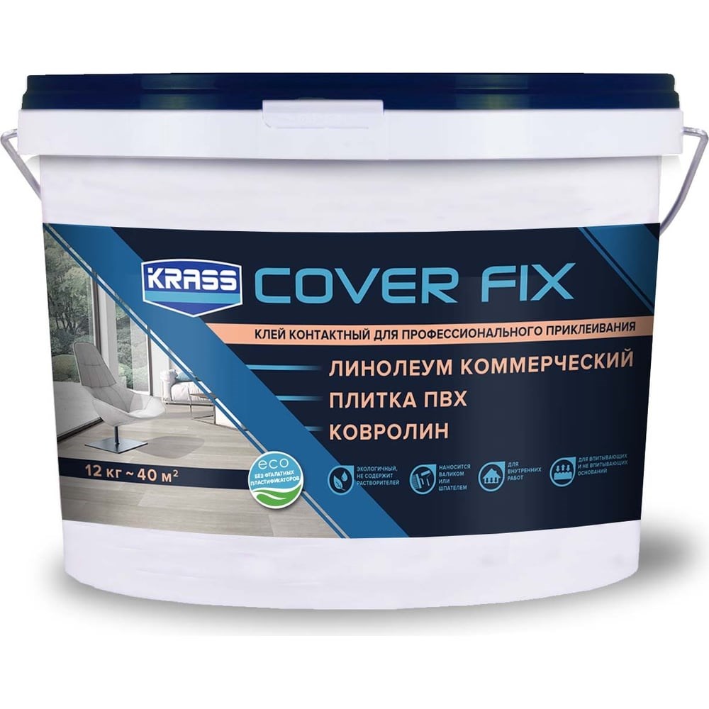 Контактный водно-дисперсионный клей KRASS 12 кг Лк-00012453 предназначен для укладки всех типов линолеума и ковровых покрытий. Рекомендуется для: линолеума коммерческого, плитки ПВХ, ковролина. Состав полностью готов к использованию. Способ применения: Перед применением состав необходимо тщательно перемешать. Работу выполнять при температуре воздуха от 15 до 25 градусов и относительной влажности не более 65%. Фиксатор наносится равномерным слоем методом сплошного нанесения на подготовленное основание поролоновым валиком. В труднодоступных местах фиксатор наносится кистью. Для фиксации рулонных текстильных покрытий допускается применение мелкозубчатого шпателя тип А4 (ТКВ). К укладке покрытия можно приступать после подсушки клеевого слоя, примерно через 20-30 минут. Клеевой слой должен перейти в контактное состояние с образованием липкой пленки, при надавливании пальцем клей не должен переходить на палец. После подсушки уложить покрытие на место приклеивания и прикатать с усилием.