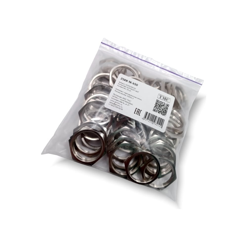 Контргайка SC 25KK Ni размер 25, никелированная латунь предназначена для внутренней и наружной установки в корпуса электротехнических устройств с целью фиксации кабельного ввода, заглушки или переходника в корпусе электротехнического устройства, толщина стенки которого не позволяет нарезать достаточное количество витков резьбы для закрепления вводного устройства. Контргайка изготавливается из никелированной латуни, что позволяет применять ее в особо агрессивных средах промышленных предприятий, во взрывоопасных зонах, в условиях морского климата, при низких и высоких температурах окружающей среды. Изделие устанавливает совместно с вводными муфтами для металлорукава или с металлическими кабельными вводами.