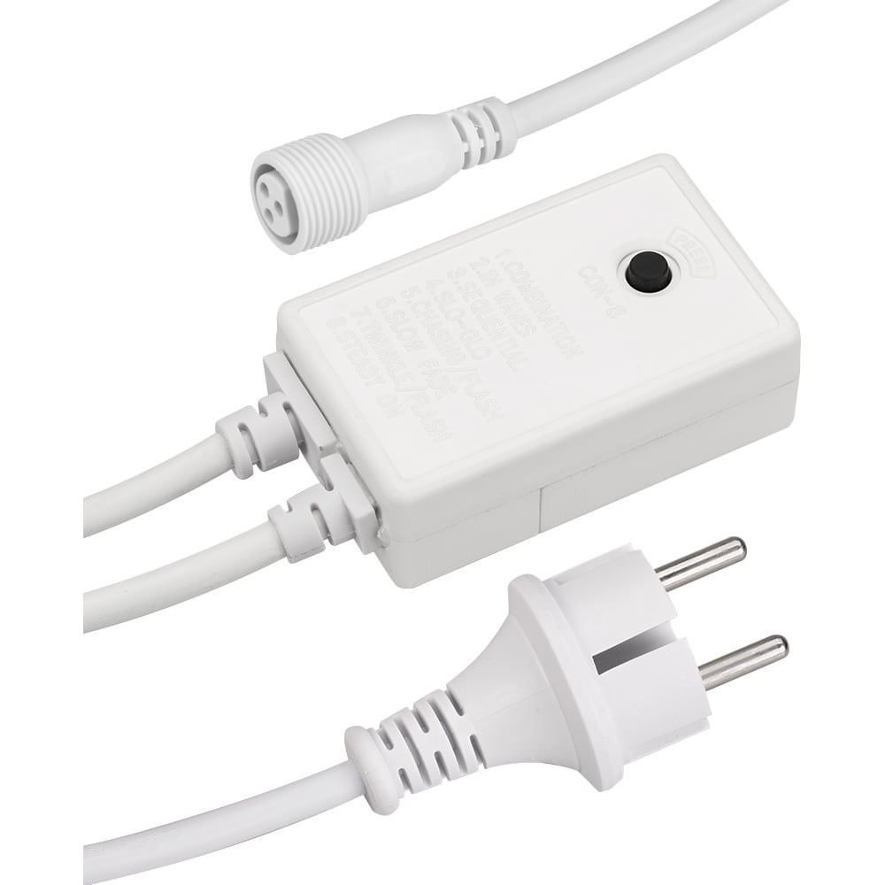 Контроллер для светодиодных гирлянд с эффектом динамики. Материал оболочки ПВХ. Цвет провода белый. В комплект входит: провод питания с вилкой европейского стандарта (IP44), 3pin разъем подключения к гирлянде, выпрямитель AC/DC (1.6A), контроллер для смены режимов динамического свечения (8 режимов). Длина провода 1.5 метра.