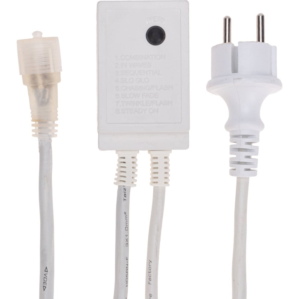 Контроллер для наборов дюралайта подходит для всех изделий длиной 6 и 14 метров с диаметром 13 миллиметров, кроме тех, в которых установлены светодиоды RGB. Электрический провод заключен в прочную оболочку из ПВХ белого цвета. Все части конструкции имеют пылевлагозащиту IP54 и могут использоваться как в помещении, так и на улице, при температуре –40...+50 °С. Контроллер с 8 режимами позволяет управлять светодинамикой LED-продукции и добиваться потрясающих эффектов.Управляющее устройство рассчитано на подключение дюралайта длиной до 30 метров. Внимание! Для наборов RGB дюралайта используется контроллер 245-907.