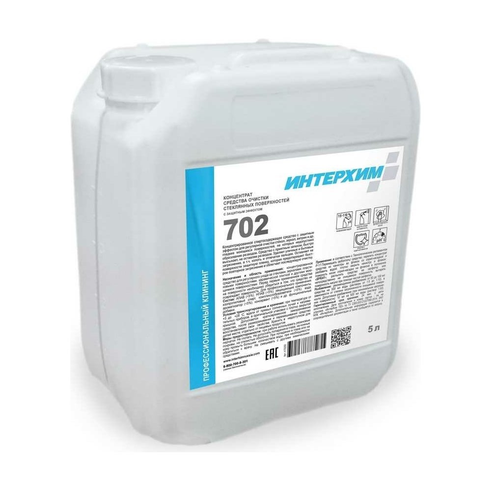 Концентрат средства очистки стеклянных и др. гладких поверхностей ИНТЕРХИМ 702 с защитным эффектом, 5 л ih70250 удаляет уличные и бытовые загрязнения, в т.ч. копоть, отпечатки пальцев. Образует защитную пленку, которая предотвращает быстрое повторное загрязнение и облегчает последующую очистку поверхности. Разведение водой любой жесткости, от 1:5 до 1:10.