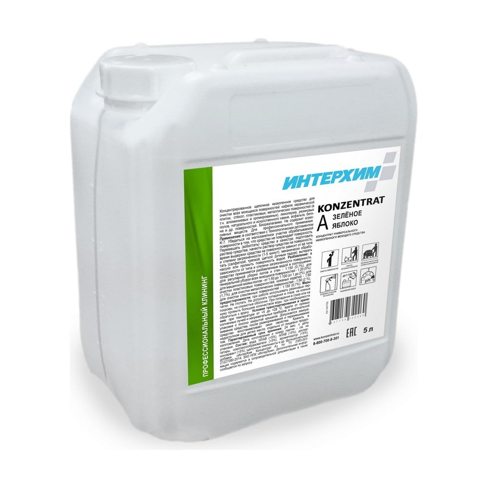 Концентрат универсального низкопенного моющего средства ИНТЕРХИМ Konzentrat A ЗЕЛЕНОЕ ЯБЛОКО 5 л kn01750 - щелочное средство с усиленным смачиванием для регулярного мытья всех поверхностей, особенно рекомендуется для керамогранита, кафеля и керамической плитки. Биоразлагаемое. Не содержит агрессивных веществ. Не требует смывания. Возможное разбавление водой до 1:150.
