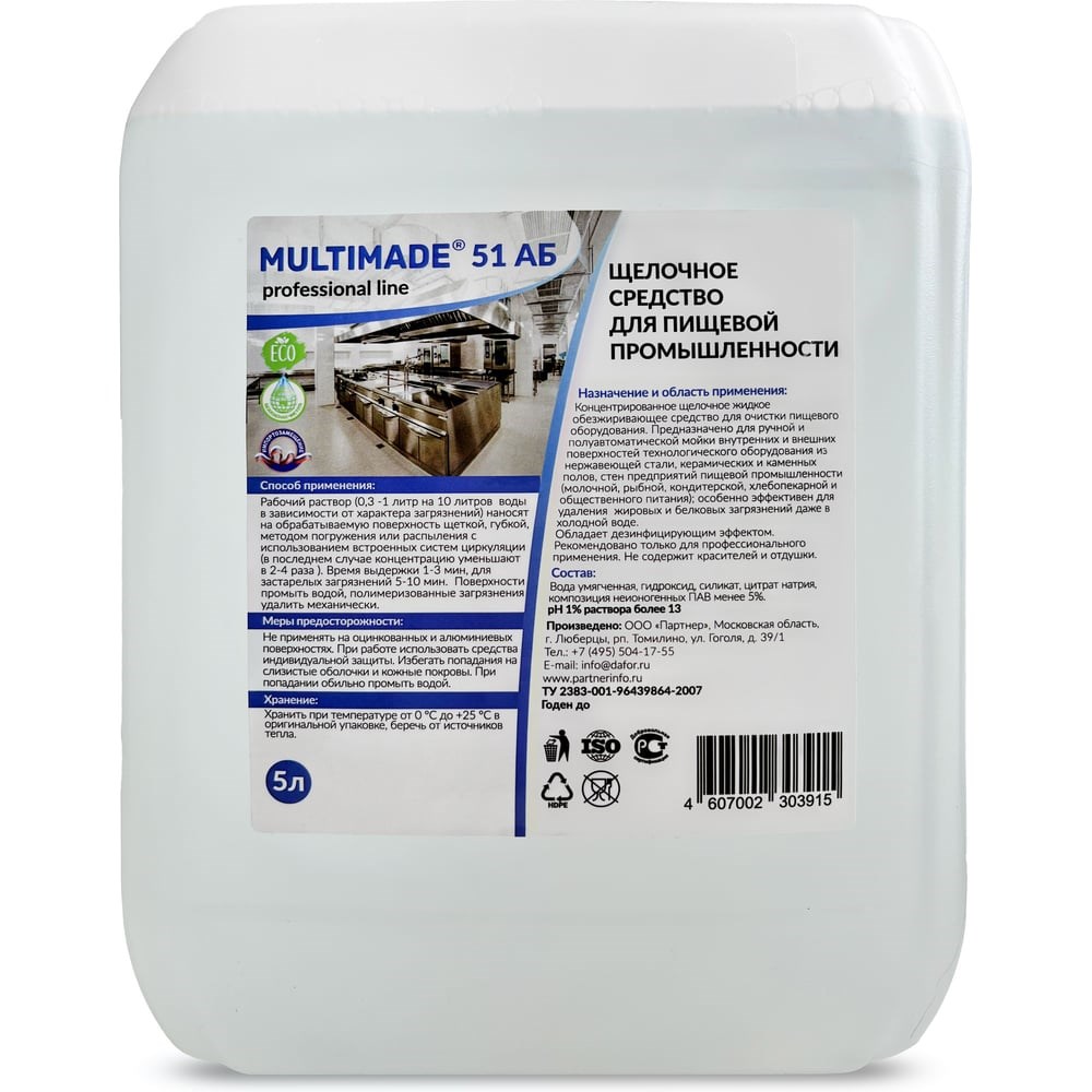 Мультимэйд 51АБ - концентрированное щелочное обезжиривающее средство для очистки пищевого оборудования. Предназначено для ручной и полуавтоматической мойки внутренних и внешних поверхностей технологического оборудования из нержавеющей стали, керамических и каменных полов, стен предприятий пищевой промышленности (молочной, рыбной, кондитерской, хлебопекарной и общественного питания).Особенно эффективен для удаления жировых и белковых загрязнений даже в холодной воде.Не применять на оцинкованных и алюминиевых поверхностях