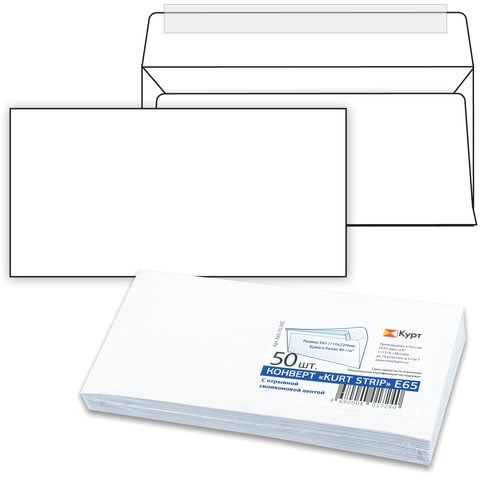Конверты Е65 (110х220 мм), отрывная лента, белые, КОМПЛЕКТ 50 шт., внутренняя запечатка, Е65.10.50С
