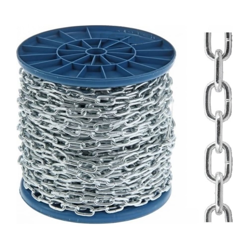 Короткозвенная цепь МЕТАЛЛСЕРВИС DIN 766, 3 мм, оцинк., 60 м 1227084 применяется в качестве растяжки. Не выносит ударных нагрузок. Используется при больших нагрузках, чем цепь длиннозвенная.