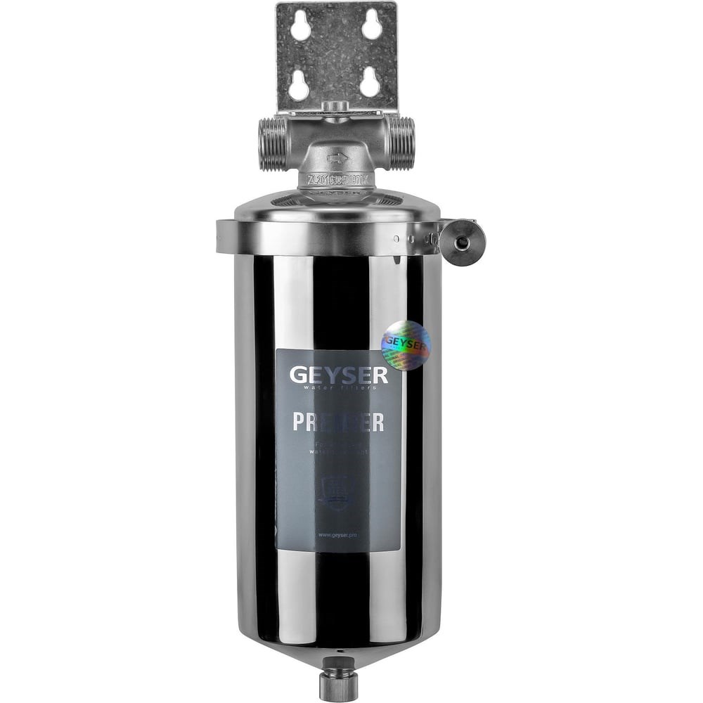 Корпус фильтра Гейзер Премьер 10BB 50754 устанавливается на вход в систему горячего или холодного водоснабжения.Корпус фильтра изготовлен из высококачественной нержавеющей стали марки 304L, устойчивой к коррозии, что гарантирует высокую надежность и многолетнюю работу фильтра. Преимуществом корпусов из нержавеющей стали является очень длительный срок службы - т.к. в отличии от пластика у металла прочностные характеристики со временем ухудшаются незначительно.Оригинальная продукция отличается наличием голограммы «GEYSER» и подписи в нижней части коробки.Для исключения появления электрохимической коррозии, корпус фильтра необходимо заземлить при установке. В случае, если корпус фильтра подключается к системе водоснабжения, состоящей полностью из металла и имеющей заземление, то дополнительное заземление корпуса не требуется.Конструктивные особенности корпусов Премьер:хомутовое соединение крышки с корпусом фильтра, благодаря этому очень легко менять сменный элемент - не надо прилагать усилий, для того чтобы отсоединить корпус. При резьбовом соединении очень часто прикипает резьба, что очень сильно затрудняет замену сменного элемента;наличие отверстие в нижней части фильтра, через которое можно легко слить воду при замене картриджа;нет никакого фиксатора картриджа внутри корпуса, благодаря этому не нужно под корпусом предусматривать большое количество места для замены сменного элемента. В следствие корпус можно установить на удобной высоте.