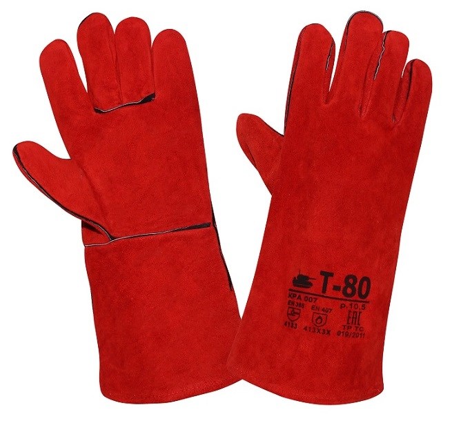 Перчатки сварщика (краги) Т-80 спилковые красные предназначены для защиты рук от механического воздействия (истирание, прокол, порез), искр и брызг расплавленного металла и работ в условиях повышенных температур. Перчатки пятипалые с подкладкой из флиса и брезента, длина 350 мм (+10/-5мм). Окрашенный спилок КРС сорта АВ (1,4 +/- 0,2 мм), обработка, обеспечивающая сохранение мягкости спилка в течение длительного времени хранения, швы усилены вставками из кожи черного цвета, используется специальная упрочненная нить.