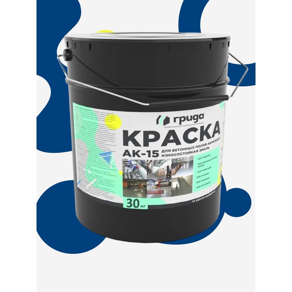 Краска для пола по бетону представляет собой износостойкое, быстросохнущее покрытие на акриловой основе и используется в подъездах, муниципальных помещениях, производственных цехах,складах, гаражах, и других местах с повышенной пешеходной и автомобильной нагрузкой. АК-15 устойчива к абразивному износу и воздействию моющих средств, растворов солей, минеральных масел и подходит для всех видов бетона. Акриловая краска АК-15 для бетонных полов укрепляет основание, повышает износостойкость и увеличивает срок его службы. Используемые в составе акриловый сополимер и железноокисные пигменты делают краску стойкой к УФ-излучению и выгоранию. За счет низкого водопоглощения, АК-15 не подвержена разрушению в зимнее время.Перед нанесением краски для пола, необходимо очистить поверхность от загрязнений, жировых пятен и пыли, а также тщательно высушить.Акриловую краску для бетона рекомендуется наносить на предварительно огрунтованное основание. Грунтовка АК-02 Грида проникает глубоко в поры бетона, укрепляет его, выравнивает основание и снижает расход краски при последующем нанесении. После подготовки, на сухое, огрунтованное основание наносится краска для бетона АК-15 в два слоя.Перед использованием обязательно перемешайте краску миксером и убедитесь в отсутствии осадка.