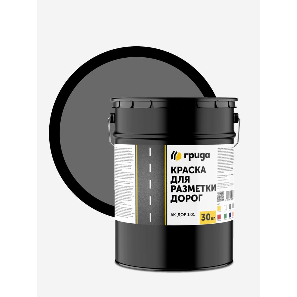 Краска для разметки дорог АК-Дор 1.01 ГРИДА предназначена для нанесения линий, надписей и других обозначений основной разметки на проезжую часть автомобильных дорог с усовершенствованным (асфальтобетонным) покрытием, бордюры, элементы дорожных сооружений и обстановки дороги; для окраски цементно-бетонных поверхностей. Линейка АК-Дор 1.01 содержит максимальное количество акрилатного связующего и как следствие максимальную стойкость к истиранию.Свойства:Краска быстро высыхает, отличается высоким уровнем светостойкости и коэффициентом яркости, что служит гарантией видимости разметки в любое время суток. Кроме того, обладает отличной адгезией, износостойкостью, стойкостью к воздействию влаги и различных химических составов.Характеристики:Время высыхания при температуре (20±0,5)ºС и относительной влажности воздуха (65±10)%- 10 минут. При пониженных температурах время сушки увеличивается.Долговечность нанесённой разметки, в зависимости от интенсивности движения.Износостойкость по методике ДорНИИ: 95%.Массовая доля нелетучих веществ: 75%.Расход 300 - 600 г/м2 на однослойное покрытие в зависимости от шероховатости и пористости поверхности, применяемого оборудования, квалификации персонала и других факторов.Степень перетира: 70 мкм.Стойкость покрытия к воздействию 3%-го раствора хлористого натрия.Стойкость покрытия к статическому воздействию воды.Условная вязкость (определяется вискозиметром типа ВЗ-246, с диаметром сопла 4 мм, при температуре 20 °С): 55 секунд.