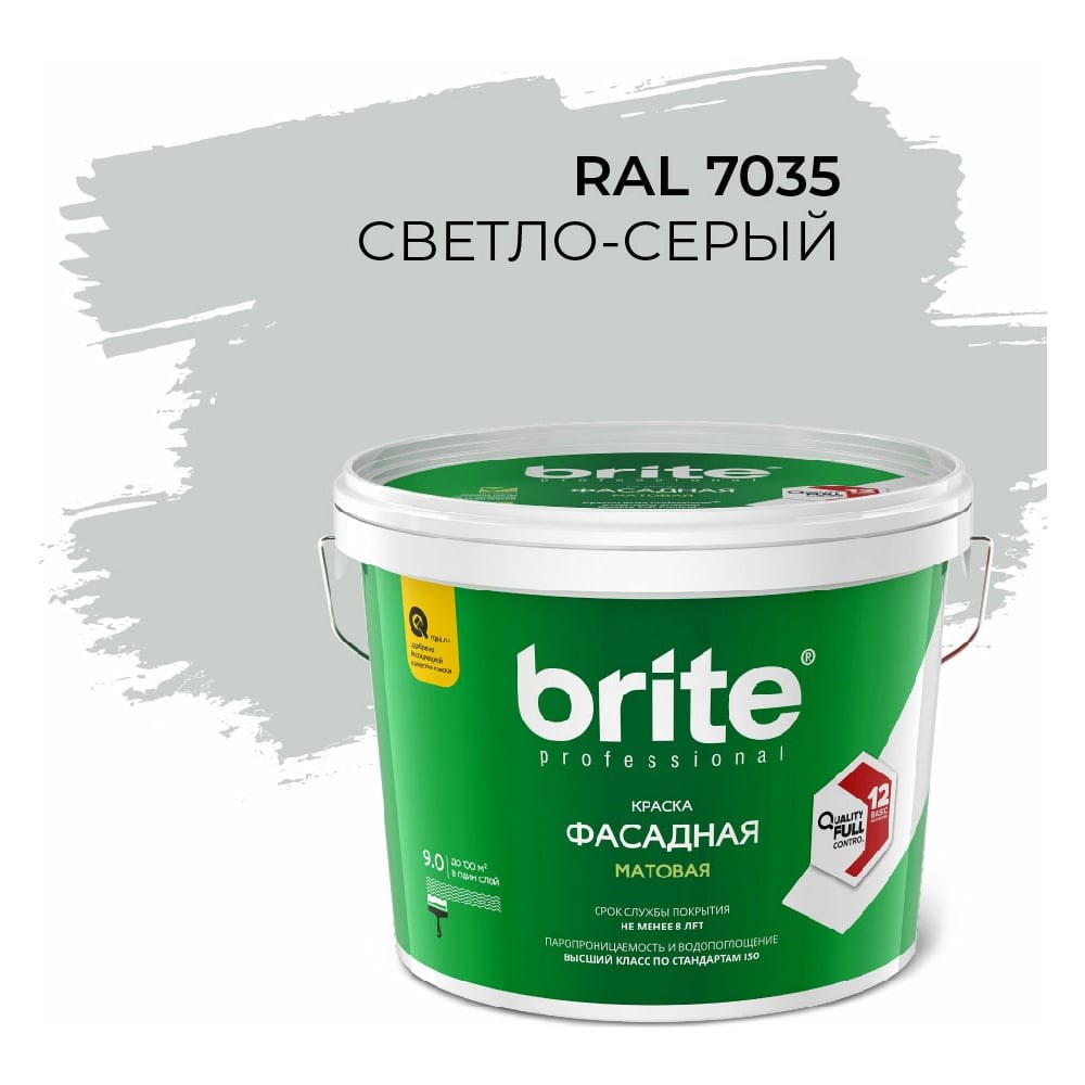 Фасадная колерованная краска BRITE PROFESSIONAL светло-серая RAL 7035, матовая, ведро 9 л О05684 - профессиональная акриловая краска предназначена для ответственных работ по окраске кирпичных, бетонных, оштукатуренных фасадов зданий категории А,Б,В для защиты от атмосферных воздействий и придания зданию эстетичного внешнего вида. Может применяться для внутренних работ для помещений с высокой влажностью. Образует долговечное "дышащее" покрытие, обладающее устойчивостью к атмосферным воздействиям (осадки, солнечное излучение, перепады температур), в том числе в условиях северных широт. Тиксотропный состав легко и ровно наносится на вертикальные поверхности, не стекает с малярного инструмента и не имеет запаха. Рекомендуется наносить в 2 слоя.