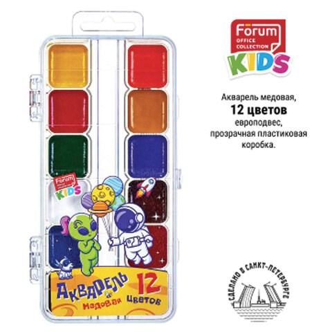 Краски акварельные FORUM "КОСМО", медовые, 12 цветов, квадратные кюветы, прозрачный пластик, FA-EV-1012-Aln