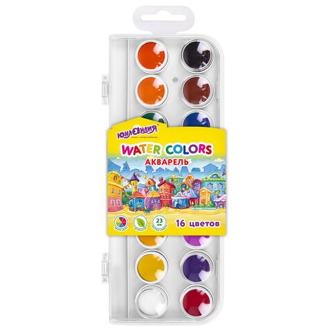 Краски акварельные ЮНЛАНДИЯ "ДОМИКИ" 16 цветов, круглые кюветы 23 мм, пенал, 192631