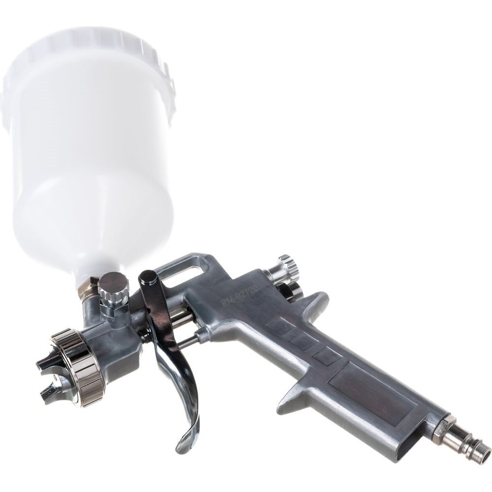Универсальный окрасочный пистолет конвекциональной системы распыления с верхним бачком. Рекомендуется для нанесения 1К синтетических эмалей, грунтов, жидкой шпатлевки. Может применяться для нанесения 2К акриловых красок и лаков. Входной штуцер: 1/4 Давление: 3,5 бар Расход воздуха:150 л/мин Объем бачка: 600 мл