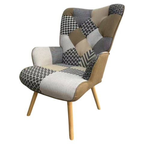 Обивка кресла выполнена из ткани с принтом в виде лоскутов. Она имеет приятные тактильные качества, легко чистится и хорошо пропускает воздух. В качестве набивки использован качественный мягкий поролон. Внутрь встроен металлический каркас, который придает конструкции долговечности и надежности. Деревянные ножки покрыты лаком.