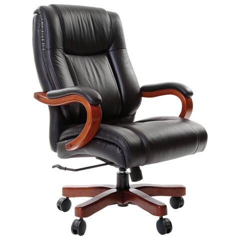 Обивка из натуральной кожи на рабочих поверхностях кресла и экокожи на нерабочих поверхностях. Каркас монолитный. Сиденье и спинка мягкие, удобные и просторные. Сиденье оснащено пружинным блоком с независимыми пружинами. Подлокотники деревянные с мягкими накладками, обитыми натуральной кожей. Механизм качания усиленный, с возможностью фиксации кресла в рабочем положении. Пятилучие металлическое с деревянными накладками, усиленное. Максимальная рекомендованная нагрузка до 180 кг. Модель класса "премиум".