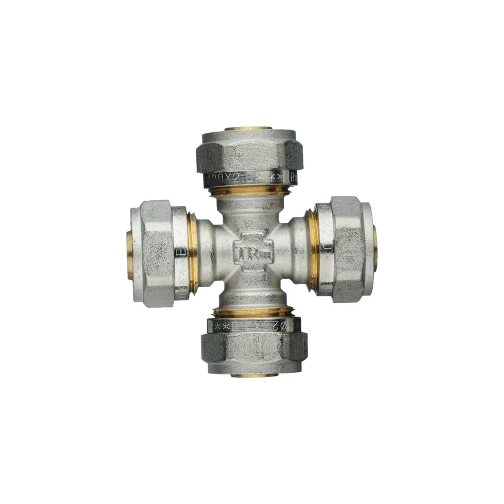 Крестовина латунная никелированная 202020*20 цанга ТeRmaкрестовина для подключения до четырёх металлопластиковых труб с диаметром 20 мм. Применяется при монтаже трубопроводов водоснабжения, водяного отопления, технологических установок, транспортирующих газы и жидкости, неагрессивные к материалам труб и соединений.