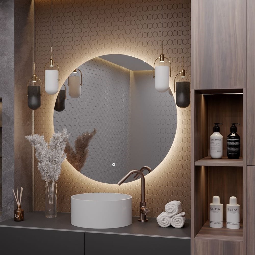 Зеркало с подсветкой в ванную "парящее". Сенсорный выключатель с белой индикацией кнопки и диммером (регулировка яркости длительным нажатием на кнопку) расположен снизу по центру. Зеркальное полотно бельгийского бренда AGC толщиной 4 мм, толщина подложки 16 мм, кромка зеркала шлифованная. Общая толщина зеркала 21 мм. Светодиодная лента в один ряд мощностью 9,6 Вт/м., 120 шт/м. Питание от сети 220В - 2 провода. Стандартное подключение – скрытый монтаж к проводу, выведенному из стены. Длина проводов на зеркале 15 см. Вывод для подключения к сети находится снизу по центру. Возможно подключение к розетке (вилка в комплект не входит). Зеркало настенное с подсветкой. Вешается на два самореза с дюбелями (входят в комплект) на проушины, расположенные на тыльной стороне зеркала. Минимальный срок службы подсветки при непрерывной работе 50 000 часов. Лента доступно расположена на подложке (в отличие от похожих моделей), и когда она перегорит можно заменить её самостоятельно.