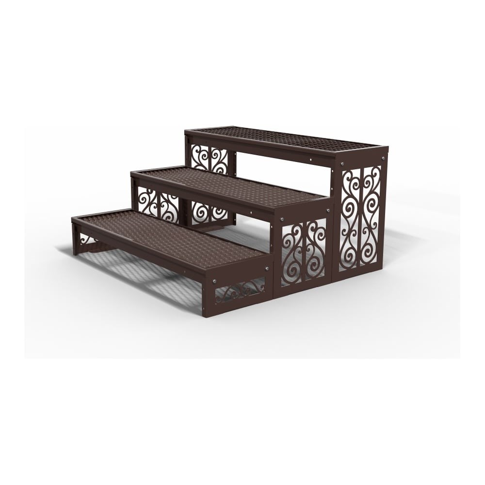 Лестница с тремя ступенями для крыльца серии «Классика». Прочная и устойчивая конструкция с покрытием из рифленого листового ПВЛ для надежного сцепления и долговечности. Лестница оснащена замкнутым металлическим контуром, предотвращающим сколы и механические повреждения. Скрытые крепежи упрощают уход и сохраняют эстетичный вид. Каркас обработан порошковой окраской по стандарту RAL 8017, что обеспечивает защиту от коррозии и долговечность. Возможно наращивание ступеней по длине и ширине. Преимущества: Прочное покрытие ПВЛ с рифленой поверхностью для надежного сцепления Замкнутый металлический контур предотвращает механические повреждения Порошковая окраска RAL 8017 для защиты от коррозии Скрытые крепежи для удобства ухода и эстетики Возможность расширения по длине и ширине