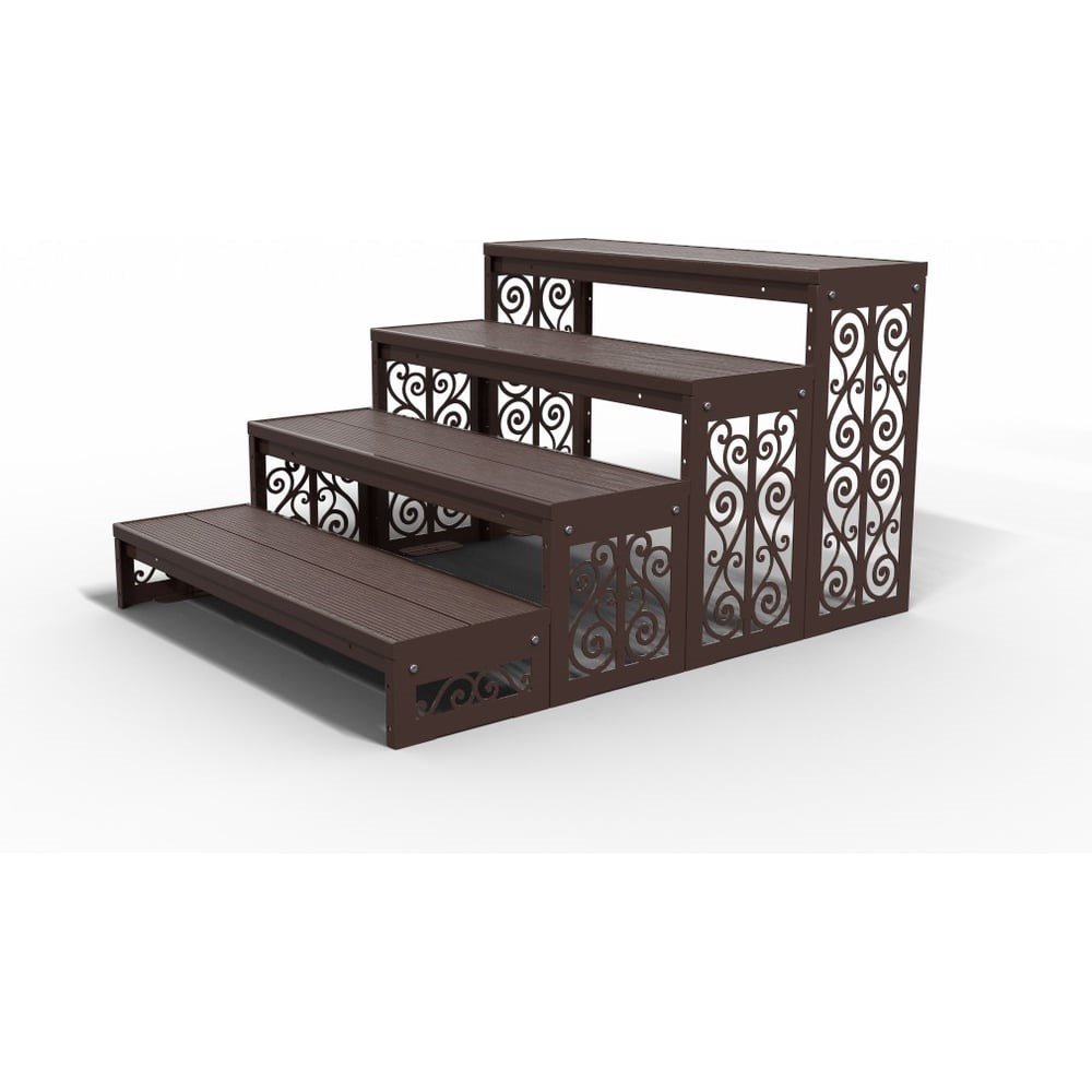 Лестница с четырьмя ступенями для крыльца серии «Классика». Прочная и устойчивая конструкция с покрытием из влагостойкой террасной доски ДПК. Лестница оснащена замкнутым металлическим контуром, защищающим покрытие и предотвращающим сколы. Скрытые крепежи упрощают уход и сохраняют эстетичный вид. Каркас обработан порошковой окраской по стандарту RAL 8017, что обеспечивает долговечность и устойчивость к коррозии. Возможно наращивание ступеней по ширине и глубине.