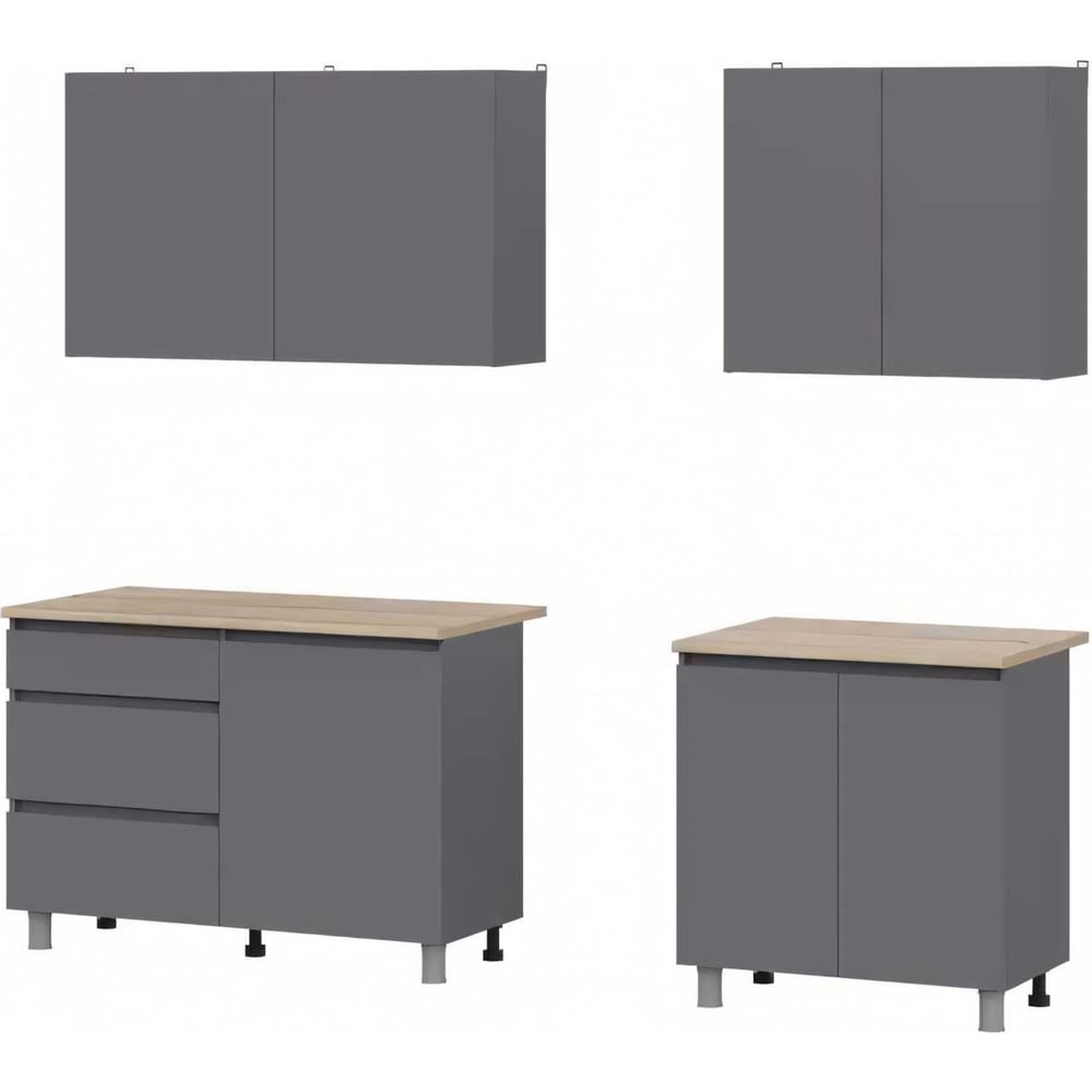 Кухонный гарнитур Денвер шириной 2 м – отличное решение для современного интерьера. Однотонные матовые фасады приятного серого оттенка не имеют лицевой фурнитуры. Состав шкафов подобран таким образом, что Вам будет удобно находиться на кухне, заниматься приготовлением блюд и хранить предметы быта и продукты. Обращаем внимание: нижний шкаф слева с ящиками и справа с глухой дверкой собираются как на картинке. Сборка не универсальная. материал: ЛДСП 16 см фурнитура дверок: накладные петли роликовые направляющие ящиков опоры 10 см