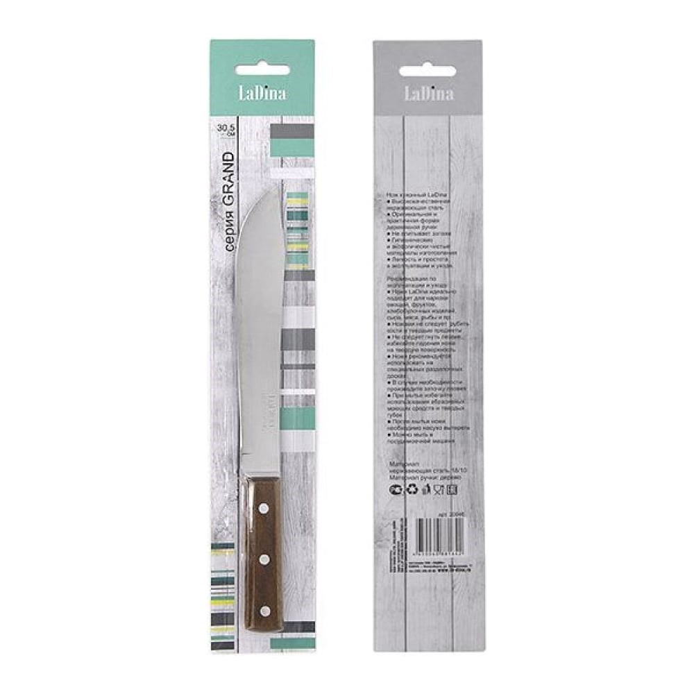 Кухонный нож Ladina GRAND деревянная ручка 30.5 см 20046 предназначен для бытового использования. Острое лезвие позволяет быстро нарезать продукты, что экономит время и силы. Благодаря эргономичной форме нож удобно лежит в руке. Изделие легко затачивается, поэтому отличается практичностью.