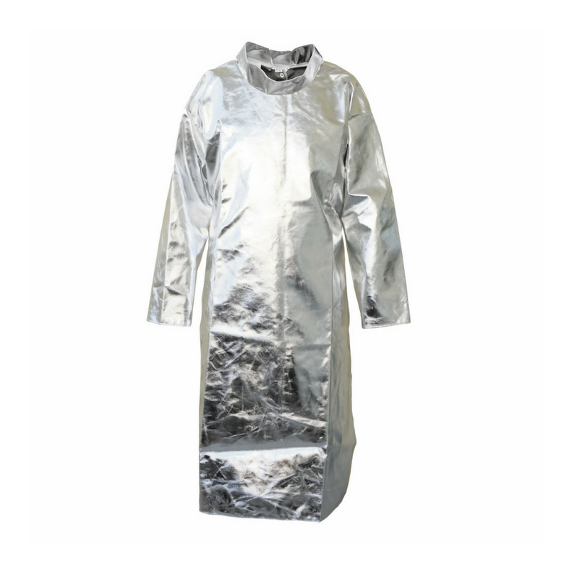 Прямой силуэт. Сзади застежка на огнестойкую контактную ленту. Воротник-стойка с застежкой на огнестойкую контактную ленту. Длинные прямые рукава. Состав: смесь преокса и алюминизированного кевларового волокна. 70% - преокс, 30% - пара-арамид алюминизированный. Плотность: 350 г/м2 Диапазон размеров: L-ХХХХL Защитные свойства по ГОСТ ISO 11612-2014 A1 - ограниченное распространение пламени B1 - защита от конвективного тепла (продолжительность воздействия 4-10 сек.) С3 - защита от теплового излучения (продолжительность воздействия 50-95 сек.) D3 - защита от выплеска расплавленного алюминия (от 350 гр.) E3 - защита от выплеска расплавленного железа (от 200 гр.) F1 - контактная теплопередача (пороговое время при 250°С от 5 сек. до 10 сек.) Защитные свойства по ГОСТ 12.4.103 Ти - защита от теплового излучения То - защита от открытого пламени Тп 400 - защита от контакта с нагретыми поверхностями от 100°С до 400°С Тт - защита от конвективной теплоты