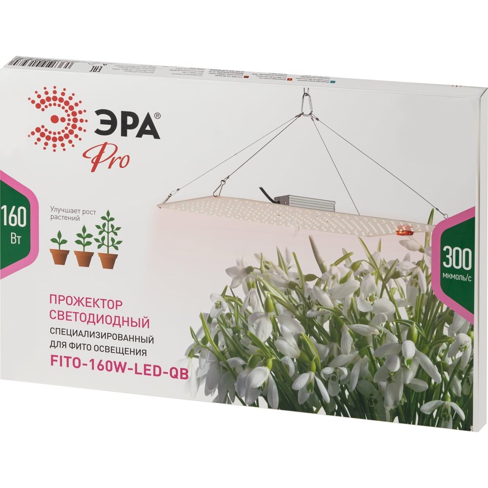 Энергоэффективность этой подвесной LED-панели для бытового использования соответствует нормативам тепличных хозяйств (ГОСТ 57671 - 2017). Применяться такой мощный фитопрожектор может очень широко - досветка рассады в квартирах, рассадные отделения теплиц, круглогодичное подвальное выращивание, гроубоксы. Может работать как единственный источник света для растений в полностью затемнённых помещениях. Свечение полного спектра подходит для всех стадий роста растения: прорастание, вегетация, цветение, плодоношение. Применены диоды Samsung. ЭРА FITO-160W-LED-QB - это полный комплект для организации фитоосвещения: светодиодная панель Quantum Board, надежный металлический блок питания (выключатель на проводе, вилка), карабин с узлом регулировки высоты подвеса (до 2 метров), карабин с тросовым креплением.