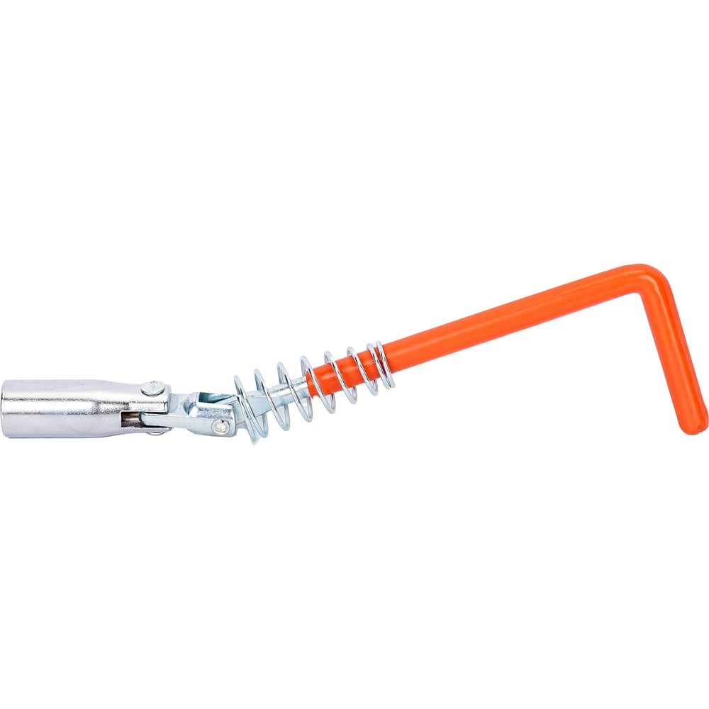 L-образный свечной ключ Airline с карданом и пружиной, 16х250 мм, с резиновым фиксатором AK-S-12 представляет собой специализированный ручной инструмент для безопасного, эффективного и быстрого изъятия и установки свечей зажигания в разнообразном оборудовании и машинах. Ключ изготовлены из высококачественной хромованадиевой стали. Тело ключа изготовлено методом горячей ковки, что придаёт ему высокую прочность и долговечность. Финишное хромированное покрытие защищает ключ от воздействия коррозии, делает его износостойким и легко очищается от загрязнений. Продуманный профиль накидной части ключа предотвращает повреждение болтов и гаек даже при самых высоких нагрузках. Эргономичный профиль рукоятки ключа позволяет развивать большее усилие без риска повреждения кистей рук.