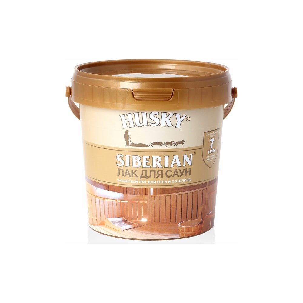 Лак для саун HUSKY SIBERIAN 0,9 л 26241 - полуматовый акриловый лак для защиты (до 7 лет) деревянных стен и потолков в банях и саунах в условиях высоких температур. Быстро сохнет, не содержит растворителей и практически не пахнет.