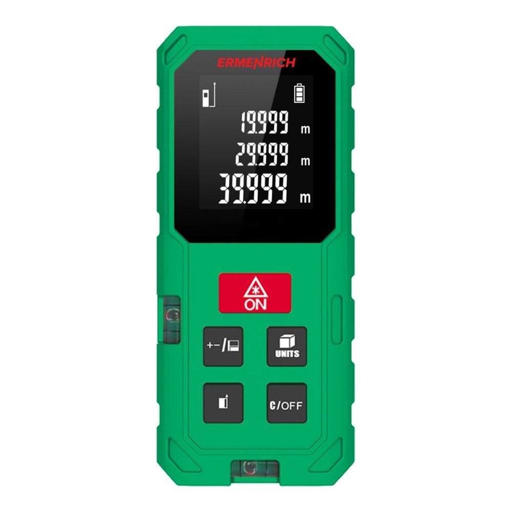 Лазерная рулетка Ermenrich Reel GS80 предназначена для измерений во время строительных или ремонтных работ. Одно из главных ее достоинств – функциональность. Она позволяет не только определять расстояния и линейные размеры объектов, но также высчитывать площадь и объем. А функция «Пифагор» поможет при вычислении расстояния между двумя точками по косвенным замерам. Два пузырьковых горизонтальных уровня позволяют устанавливать прибор ровно, что делает измерения максимально точными. Компактная и эргономичная, рулетка имеет большой экран с тремя строками и кнопочное управление. Точку отсчета расстояния можно менять – измерения будут проходить от верхней или нижней части прибора. Память рулетки сохраняет до 20 групп результатов. Работает прибор от стандартных батареек типа ААА. Автоматическое отключение лазера через 30 секунд и самого прибора через 180 секунд помогает экономить заряд. Индикатор заряда батареи поможет вовремя заменить элементы питания, чтобы инструмент был готов к работе в нужный момент.