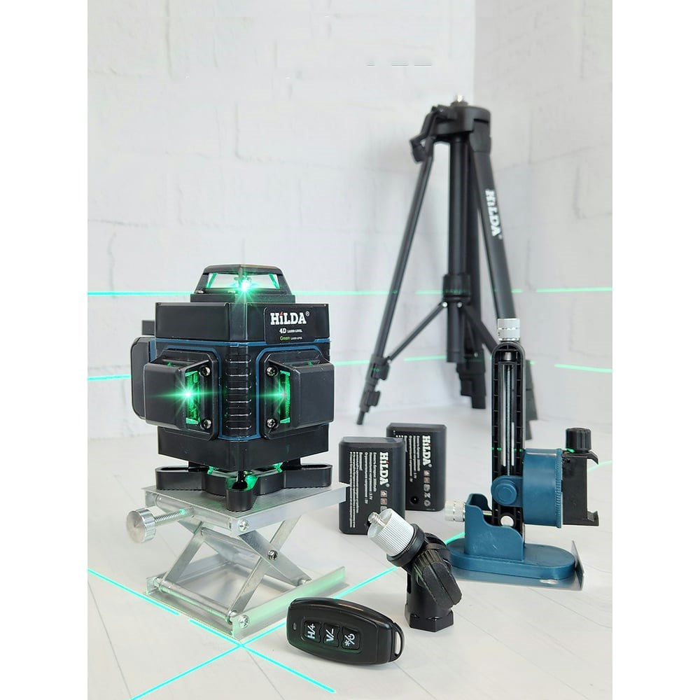 Профессиональный лазерный уровень нивелир 4d 360 строительный самовыравнивающийся со штативом и кейсом в новом цвете (защита от подделки). Самовыравнивающийся лазерный уровень при отклонениях более 3 градусов издает пищание и моргание. Особенности: Цвет лучей — зеленый. Дальность до 30 м. Мощность АКБ — 3000 mAh (до 8ч беспрерывной работы) Два горизонта и две вертикали, все светят в 360 градусов. Нижний горизонт 1.5 см от пола. Лучи можно включать как все сразу так и попеременно с сенсорных кнопок на уровне или с пульта. Функция построения кривых линий — да. Импульсивный режим для работы с приемником — да. Уменьшение и увеличение яркости — да. Точка отвеса — да.