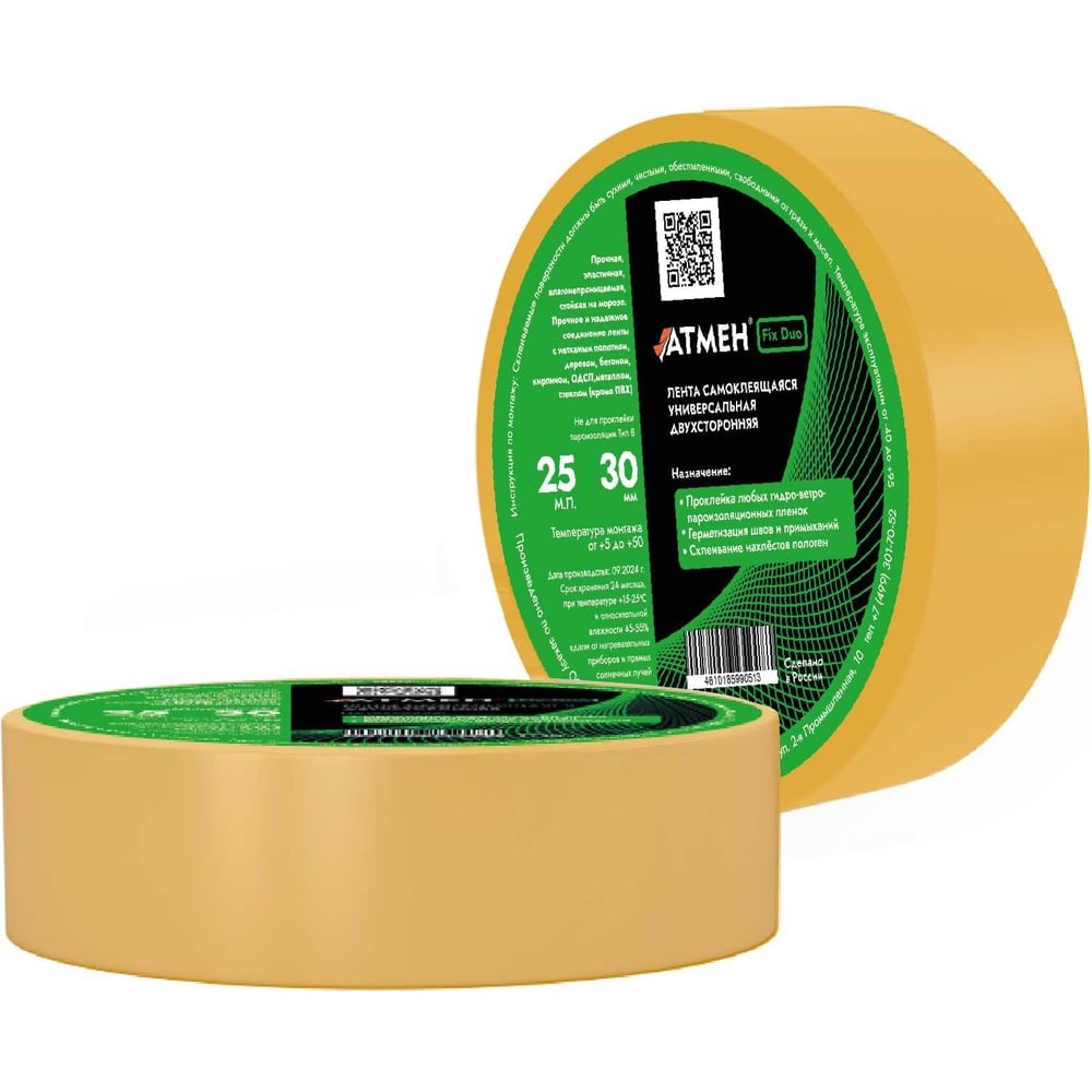 Атмен Fix Duo Лента 30 мм х 25 м самоклеящаяся универсальная двусторонняя лента для монтажных, ремонтных, отделочных работ, характеризуется превосходной адгезией и начальной липкостью. Усиленный клеевой состав обеспечивает прочное соединение в том числе на вертикальных поверхностях под нагрузкой. Не подходит для работы с ПВХ. Используется: Проклейка любых гидро-ветро-пароизоляционных пленок Герметизация швов и примыканий Склеивание нахлестов рулонов Температура нанесения от +10, температура эксплуатации от - 30 до +95 градусов.