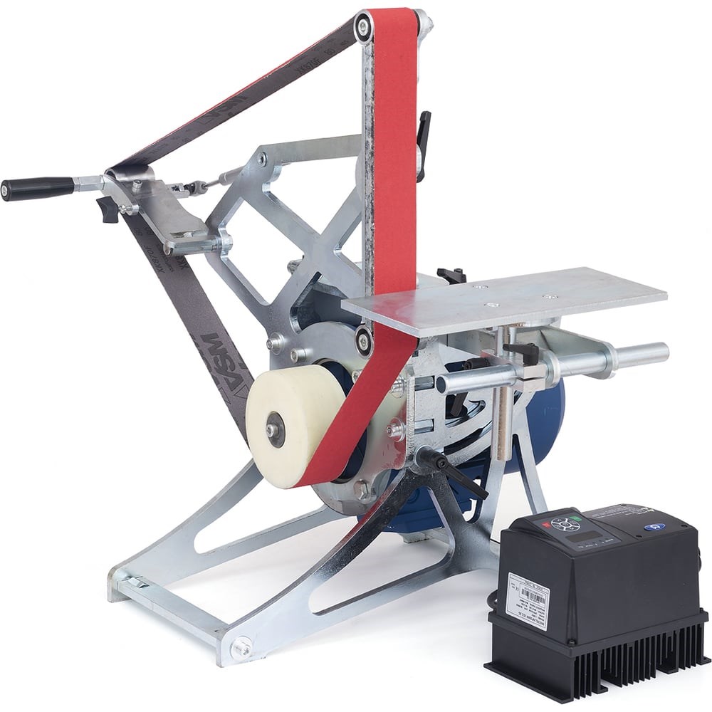 Новый ленточный гриндер профессионального класса под ленту 1600х50 мм. Уникальная безригельная схема дает нашему ленточно-шлифовальному станку беспрецедентную жесткость конструкции. В конструкции гриндера реализован поворотный кронштейн, что позволяет легко переносить исполнительный механизм гриндера относительно опорного столика. Можность двигателя 2,2кВт, частотный преобразователь в комплекте позволяет регулировать скорость ленты от 0 до 20м/с, что позволяет работать с различными материалами, пластиком, деревом, камнем и др. Приемущество такой длины ленты - лента лучше охлаждается во время работы за счет оптимальной длины и меньше изнашивается, что позволяет продлить ее срок службы. В базовой версии станка упорная плита из гранита, что обеспечивает хорошее скольжение ленты и долговечность упорной поверхности. Столик можно наклонять относительно ленты +/- 45гр. Жесткость конструкции обеспечивается толщиной стальной оцинковоной рамы 10мм. Перед отправкой все станки проходят предпродажные пуско-наладочные работы.Гриндер имеет 3 рабочие позиции:вертикальная шлифовка;горизонтальная шлифовка;контуровка на ролике.Рекомендуется для использования как на предприятиях, так и в небольших мастерских.
