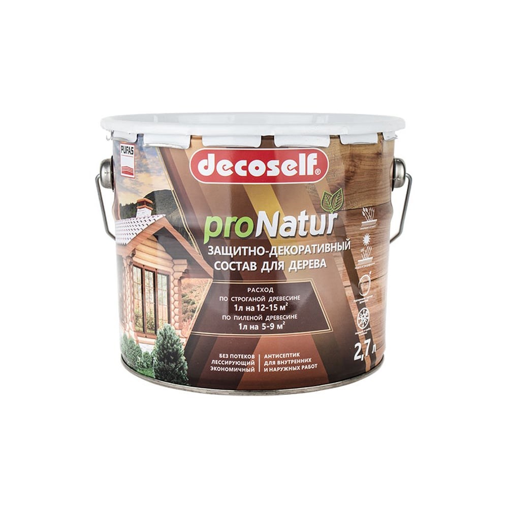 Лессирующий антисептик для дерева Pufas тик Decoself 2.7 л тов-200291 применяется для окрашивания любых наружных и внутренних деревянных поверхностей: стен, потолков, перил, плинтусов, лестниц, заборов, садовых строений, фасадов домов, срубов, оконных рам и других конструкций из дерева (влажностью до 40%), фанеры, ДСП и ДВП. Состав образует на поверхности древесины воздухопроницаемое, биозащитное, влагоотталкивающее, эластичное полимерное покрытие. Сохраняет и усиливает текстуру древесины, придает ей желаемый оттенок. Продукт обладает повышенной устойчивостью против выцветания и биозащитной активностью. Пропитка содержит водоотталкивающие и УФ-абсорбирующие материалы, что обеспечивает высокую степень защиты деревянных изделий, эксплуатирующихся в жестких погодных условиях. Расход: По строганой и бревенчатой поверхности древесины 1 л на 12 - 15 кв.м. По пиленой поверхности древесины 1 л на 5 - 9 кв.м.