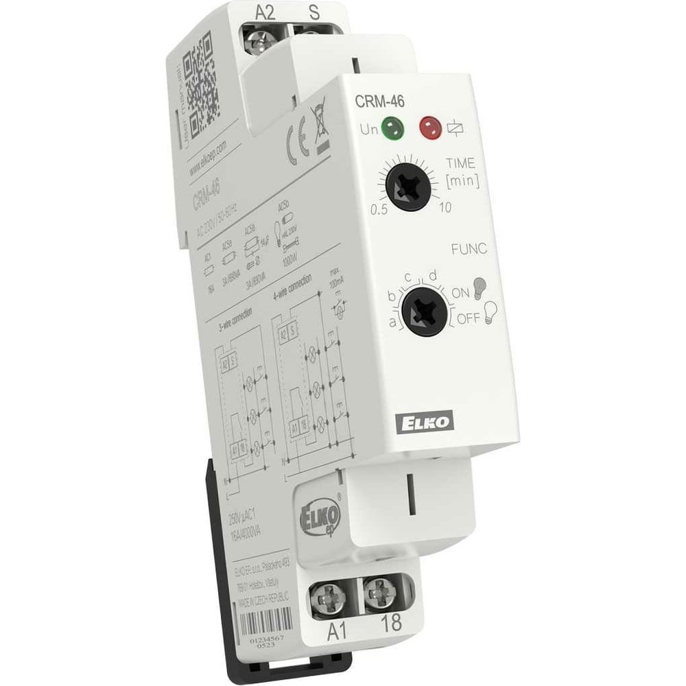 Дополнительные технические характеристики лестничного автомата ELKO CRM-46/230 AC 230 V EP НФ-00000118: 6 функций: a - программируемый лестничный автомат с задержкой выключения и сигнализацией перед выключением. b - программируемый лестничный автомат с задержкой выключения без сигнализации перед выключением. c - импульсное реле. d - импульсное реле с таймером. ON (постоянно включено) - напр. при уборке помещения. OFF (постоянно выключено) - напр. при замене светильников. Настраиваемый диапазон времени, минут - 0,5-10. Отсчет времени может быть остановлен долгим нажатием на кнопку управления (>2с) - функция a, b. Возможность соединения управляющих кнопок с лампами накаливания (макс. 100мA). Выходной контакт 16A AC1 (4000VA), импульсный ток до 80А. Возможность подключения 3 или 4 проводов.