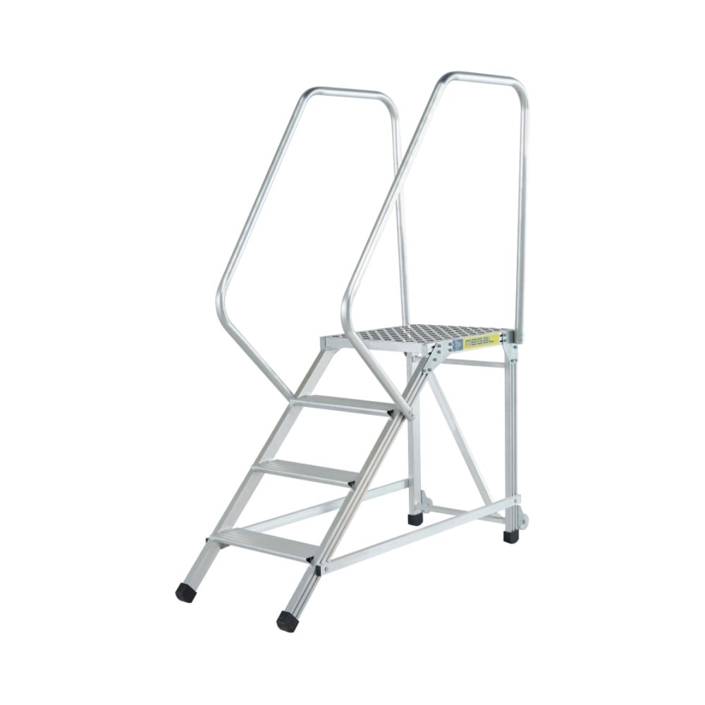 Лестница-подмости с двумя поручнями MEGAL ЛП-1.0 051804 предназначена для обеспечения комфортных условий труда при выполнении монтажных, сервисных и других работ на небольших высотах. Сверху подмости укомплектованы двумя поручнями, снизу – резиновыми противоскользящими башмаками. Для удобства перемещения по рабочей территории модель оснащена комплектом колес. Широкие ступени глубиной 16 см из специального рифленого профиля обеспечивают безопасный подъем и комфорт в работе. Верхняя площадка имеет размер 60х70 см. Наклонный лестничный маршрут расположен под углом 45 градусов.