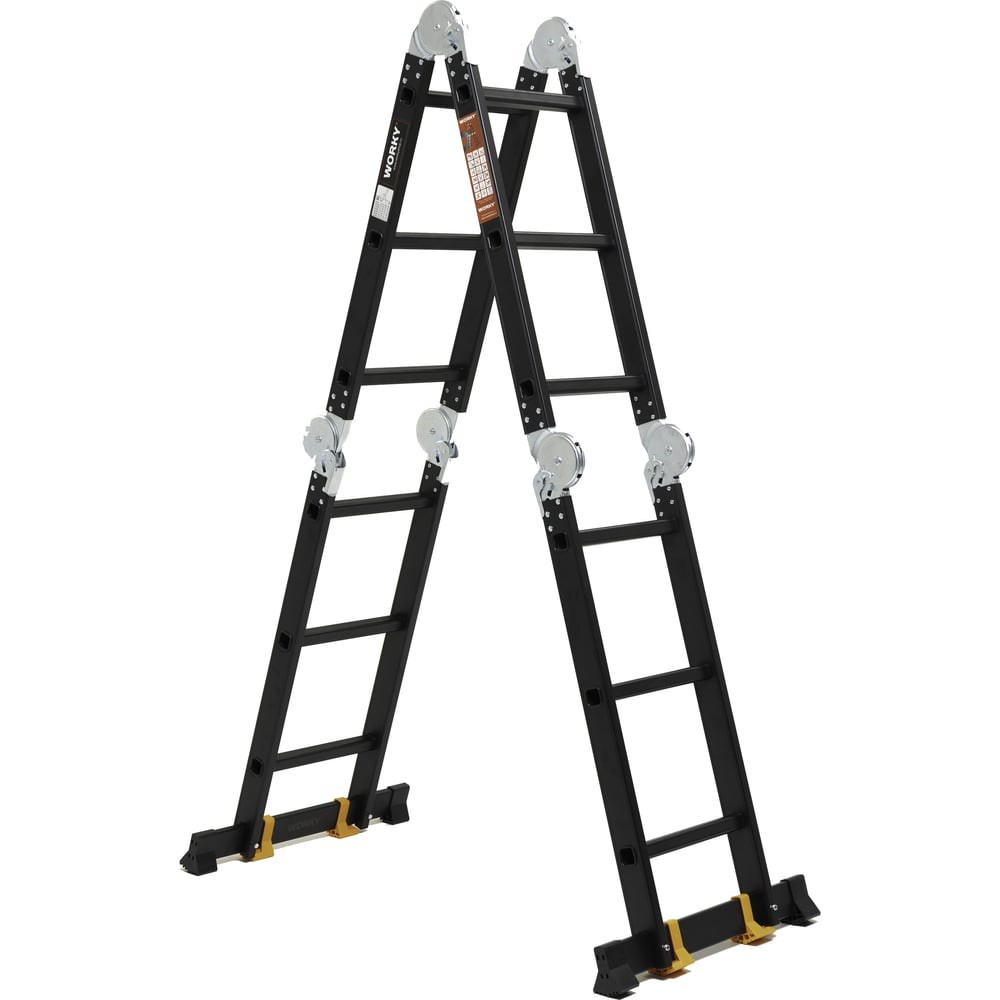 Профессиональная лестница трансформер 4х3 WORKY серия Pro изготавливается из алюминия высокого качества с повышенной устойчивостью к коррозии, что выгодно увеличивает срок эксплуатации лестницы по отношению к современным аналогам. Гарантия 5 лет.Лестница снабжена высокопрочными узлами шарнирных замков «Super Pro» из легированной стали. Это обеспечивает простоту использования лестницы и гарантирует качественную фиксацию шарниров, что влияет на безопасность и удобство при эксплуатации лестницы. Шарнирные замки надёжно впрессованы в направляющий усиленный профиль размером 60х30х1,5 мм и расклёпаны цельнометаллическими заклёпками. Усиленный профиль ступеней 28х28х1,5 мм, обеспечивает высокую стойкость к нагрузкам. Рифленые ступени гарантируют надёжное сцепление стопы с поверхностью. Максимальная рабочая высота – 4,9 м. (этот параметр определяет высоту, до которой можно свободно дотянуться, стоя на верхней ступени лестницы)Высота приставной лестницы – 3,6 м. Высота в режиме стремянка – 1,75 м.Высота в режиме помост – 0,98 м.Высота в сложенном виде - 0,95 м.Ширина лестницы 350 мм позволяет комфортно проводить работы на любой высоте.Ступени закреплены методом многократной развальцовки, что обеспечивает высокую прочность и долговечность конструкции. Габариты лестницы в сложенном состоянии – 950х260х360 мм. Максимальная нагрузка на все профессиональные лестницы WORKY - 150 кгВНИМАНИЕ максимально допустимая нагрузка в режиме помост – 120 кг.