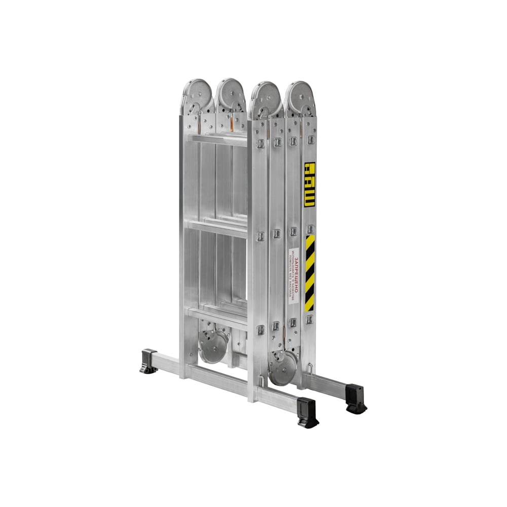 Многофункциональная лестница-трансформер из алюминия состоит из секций, соединенных плоскими шарнирами с автоматическими замками, изготовленными из прочной гальванизированной стали. Может использоваться в четырех конфигурациях: Односекционная приставная лестница; Приставная лестница с Г-образным упором; В качестве подмости; Двухсторонняя стремянка. В сложенном виде лестница-трансформер компактна и занимает очень мало места при складировании. Чрезвычайно устойчивой лестницу делают два стабилизатора, оснащенные нескользящими башмаками. Шарнирные узлы автоматически защелкиваются в любой из предусмотренных конфигураций использования.
