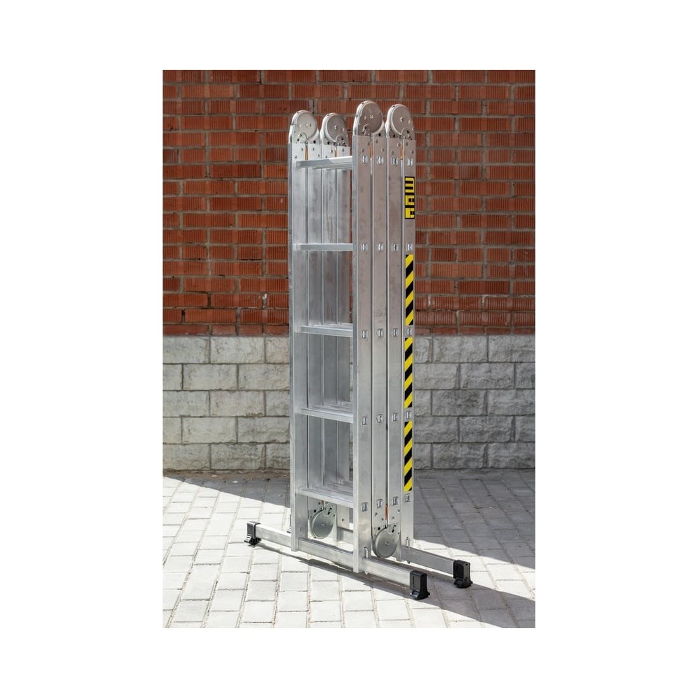 Многофункциональная лестница-трансформер из алюминия состоит из секций, соединенных плоскими шарнирами с автоматическими замками, изготовленными из прочной гальванизированной стали. Может использоваться в четырех конфигурациях: Односекционная приставная лестница; Приставная лестница с Г-образным упором; В качестве подмости; Двухсторонняя стремянка. В сложенном виде лестница-трансформер компактна и занимает очень мало места при складировании. Чрезвычайно устойчивой лестницу делают два стабилизатора, оснащенные нескользящими башмаками. Шарнирные узлы автоматически защелкиваются в любой из предусмотренных конфигураций использования.