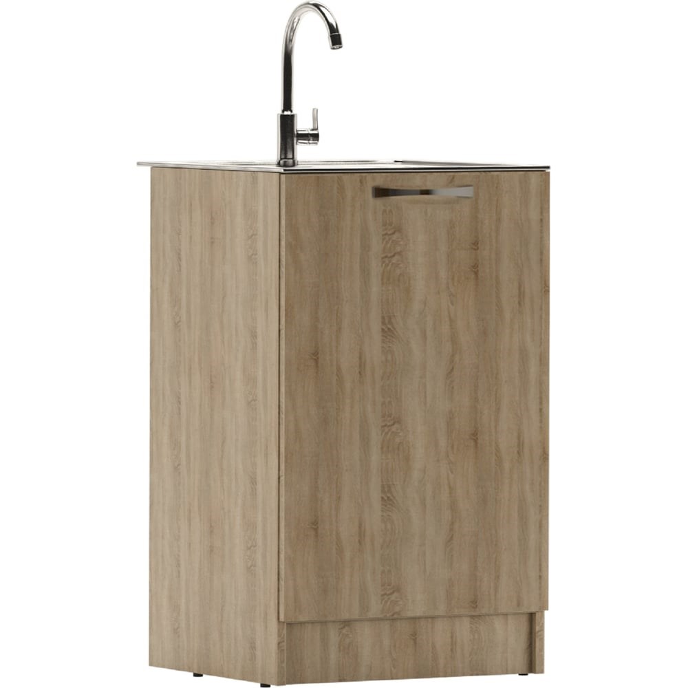 Тумба под нержавеющую мойку 50х50 Дуб Сонома, левая/правая предназначена для декорации помещения. Мебель для кухни от российской марки ДОМИНО обладает простыми линиями и простотой в использовании. Тумба имеет две распашных дверцы. Корпус и фасад выполнены из ЛДСП. Благодаря высокой прочности прослужит долгое время. Современный дизайн тумбы впишется в любой интерьер. Поверхность изделия легко чистится и не требует сложного ухода. Тумба поставляется в разобранном виде. Внимание! Нержавеющая мойка приобретается дополнительно!