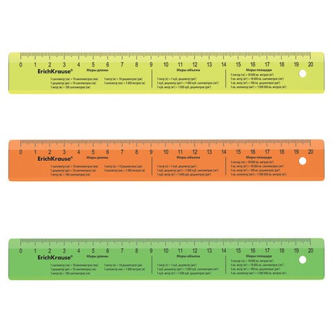 Линейка пластиковая 20 см, ERICH KRAUSE "NEON", с единицами измерения, ассорти, 55502