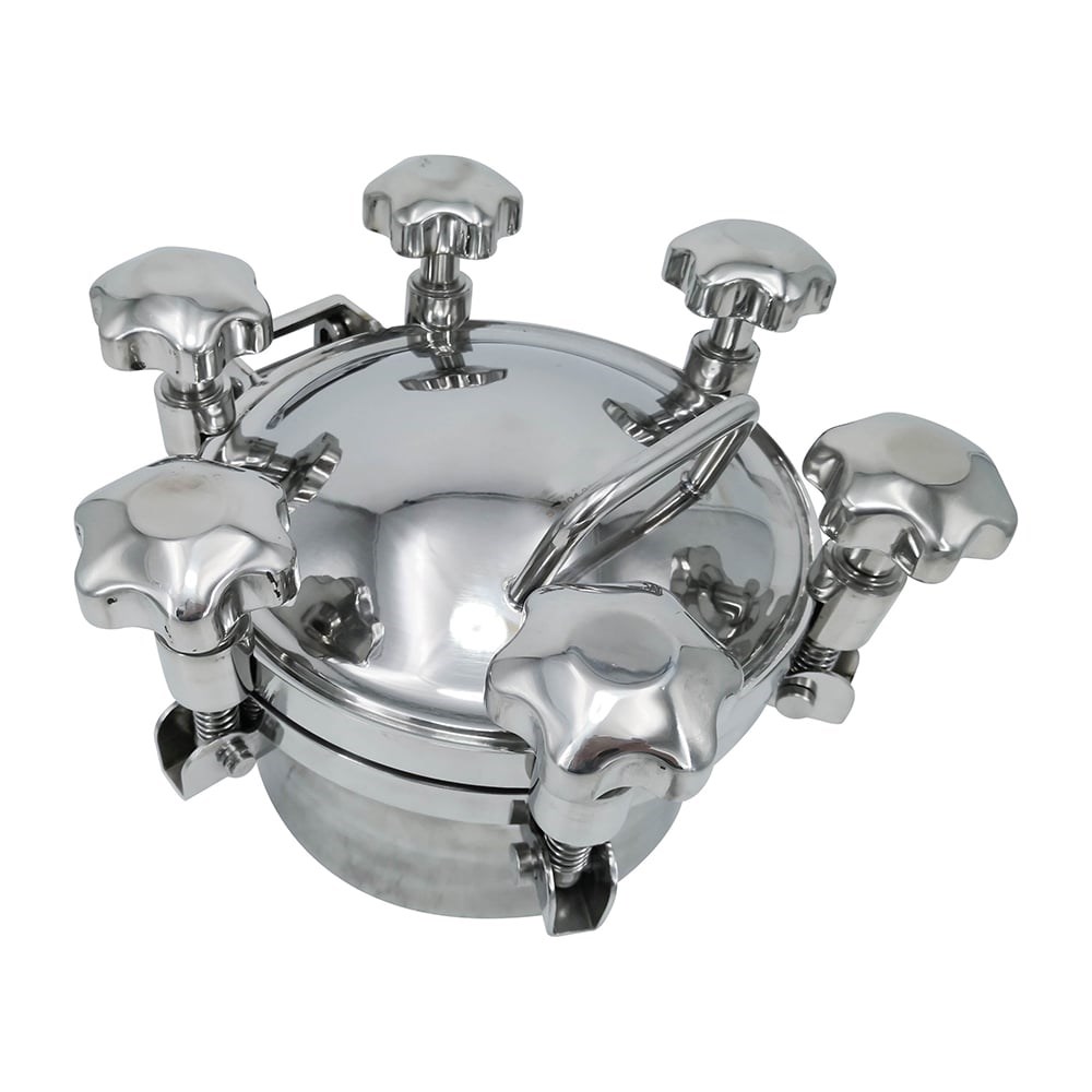 Люк круглый DN200 для баков/емкостей обладает длительным сроком службы; устойчив к агрессивным средам и перепадам температур; имеет максимальную герметичность; выдерживает давление до 5 бар; выполнен с идеальной полированной поверхностью, которая предотвращает загрязнение и развитие вредоносной флоры. Это надёжное изделие из нержавеющей стали для систем с давлением до 5 бар, которое применяется для оснащения баков и емкостей, использующихся в пищевой, химической и фармацевтической промышленности. Уплотнение люка изготовлено из материала: Силикон. Крышка люка закрывается четырьмя ручками/барашками, изготовленными из нержавеющей стали.