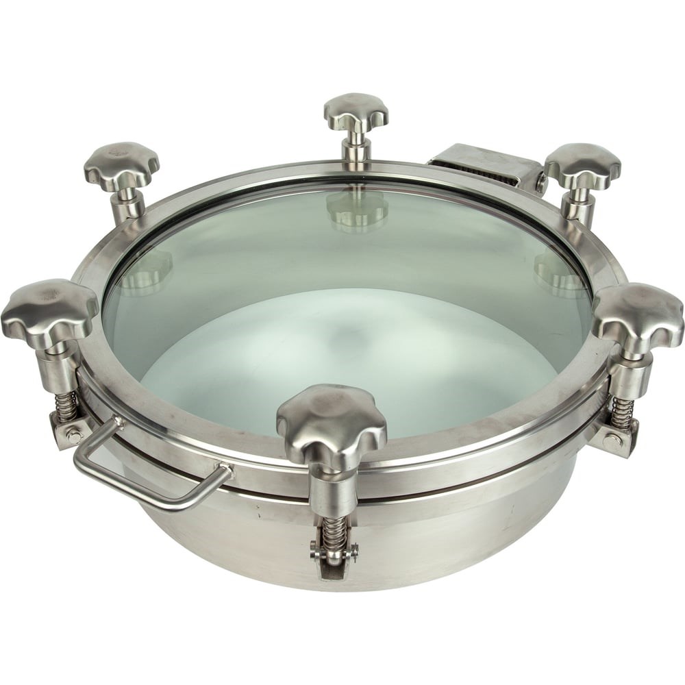 Круглый люк со стеклянной крышкой DN500 для баков/емкостей обладает длительным сроком службы; устойчив к агрессивным средам и перепадам температур; имеет максимальную герметичность; выдерживает давление до 3 бар; выполнен с идеальной полированной поверхностью, которая предотвращает загрязнение и развитие вредоносной флоры. Это надёжное изделие для систем с давлением до 3 бар, которое применяется для оснащения баков и емкостей, использующихся в пищевой, химической и фармацевтической промышленности. Уплотнение люка изготовлено из материала: Силикон. Крышка люка закрывается шестью ручками/барашками, изготовленными из нержавеющей стали. Толщина стеклянной крышки - 19 мм.