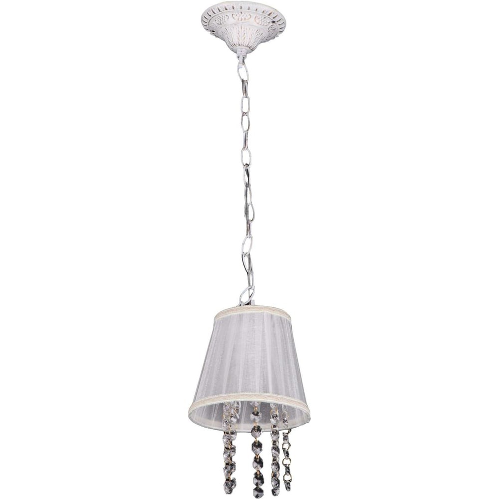Люстра De Fran Е27 220В 1x60Вт белый + кристаллы, AP5-161 WT+WT серии Исида выполнена в романтическом стиле может быть использована в комнатах с высоким потолком или размещена над поверхностью стола или в зоне отдыха с возможностью регулировки высоты подвеса во время установки светильника. В конструкции светильника присутствует полупрозрачная ткань и хрустальные подвески. Для обеспечения необходимой освещенности и оригинального дизайна такие модели нередко устанавливают группами в ряд или на подвесах различной высоты.