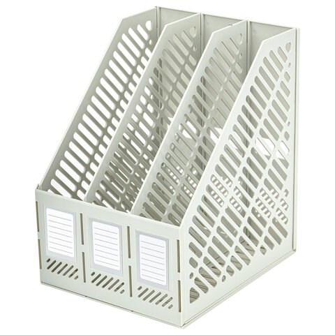 Выполнен в сером цвете с тремя отделениями и с табличками для маркировки. Предназначен для хранения бумаг формата А4. Представляет собой устойчивую разборную конструкцию с сетчатыми поверхностями. Поставляется в разобранном виде. Размеры: высота - 293 мм, ширина - 215 мм, глубина - 255 мм.