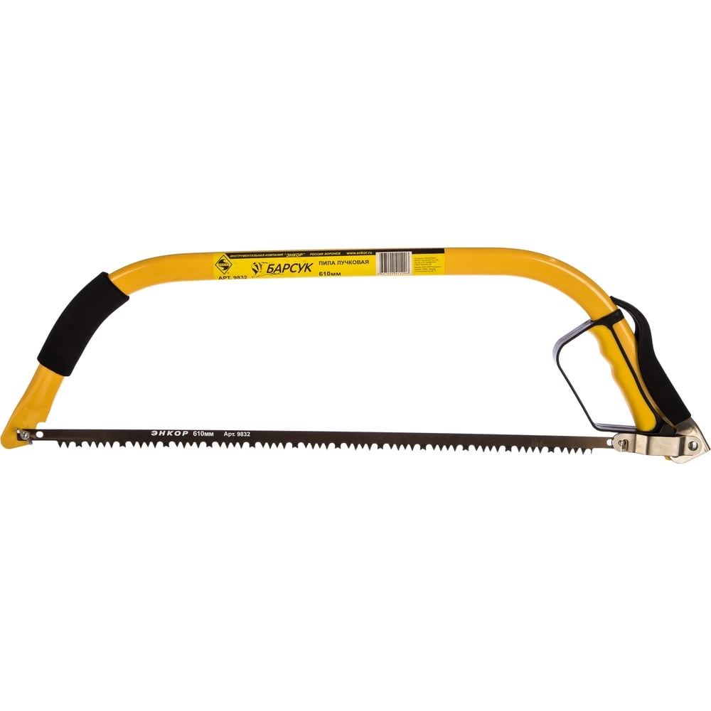 Лучковая пила 610 мм Энкор Барсук 9832 применяется для подрезки деревьев в саду и кровельных работ. Полотно надежно зафиксировано, что гарантирует безопасность. Рукоятка с ограждением для пальцев предохраняет руки оператора от проскальзывания во время работы. Пила имеет размер 610 мм.